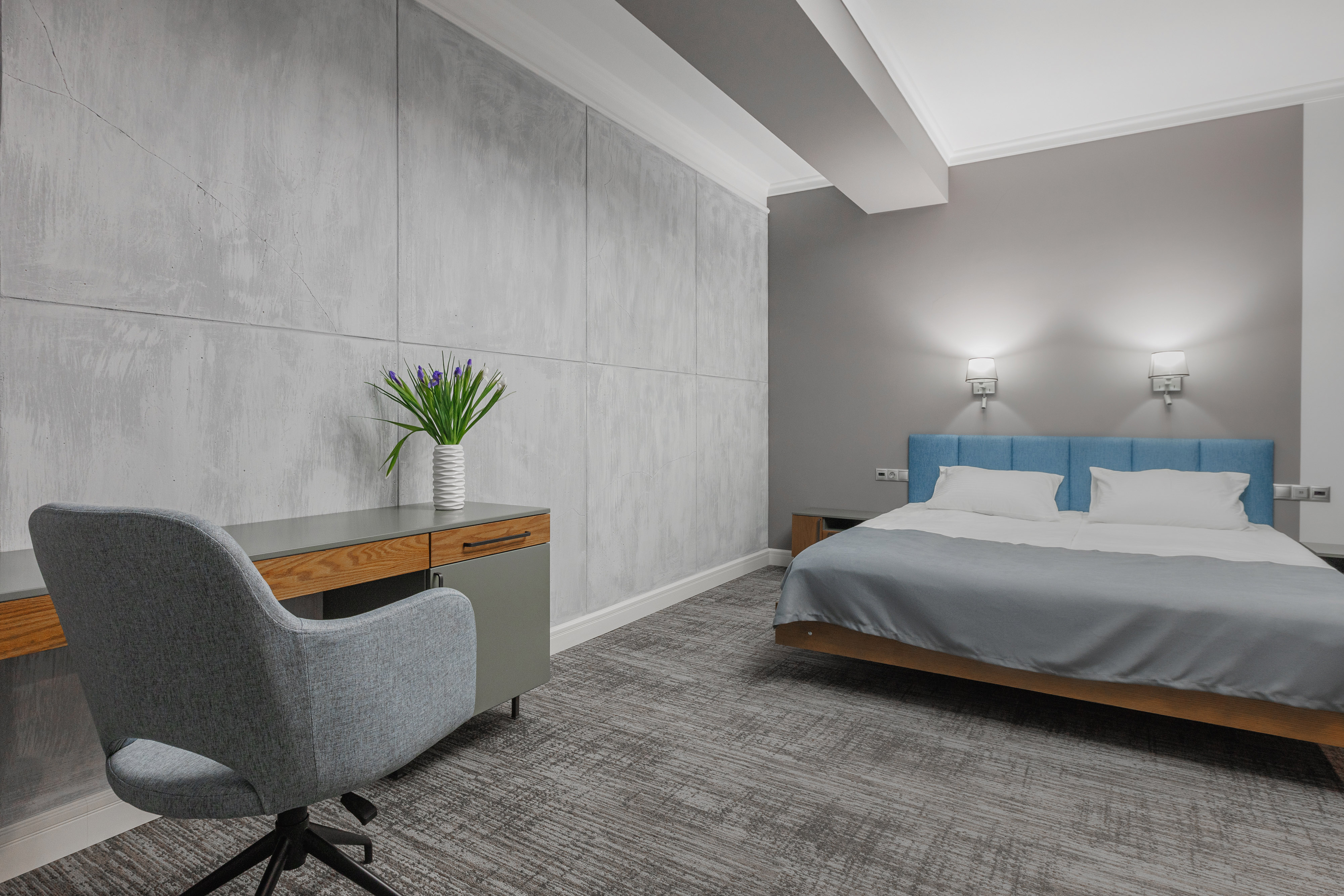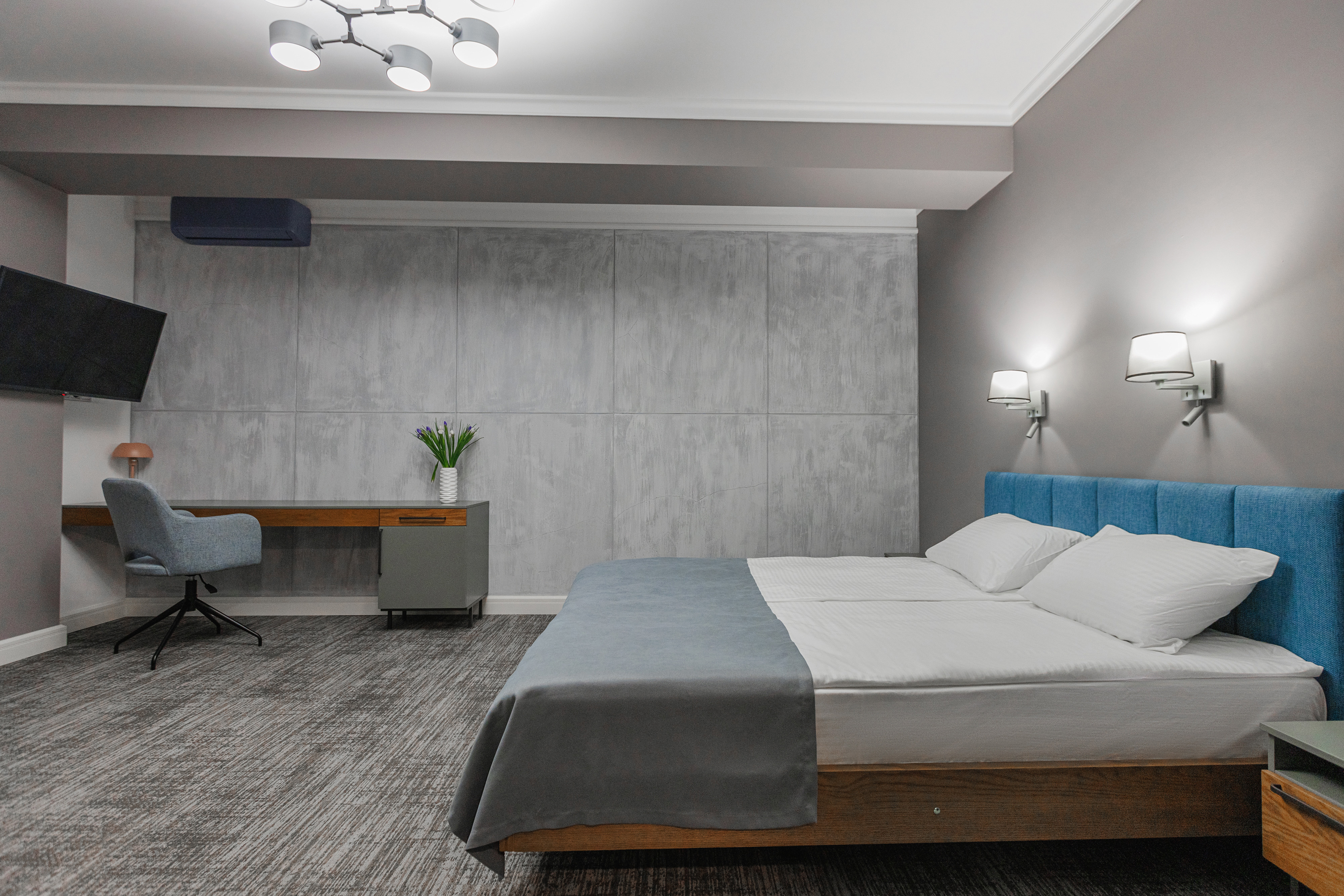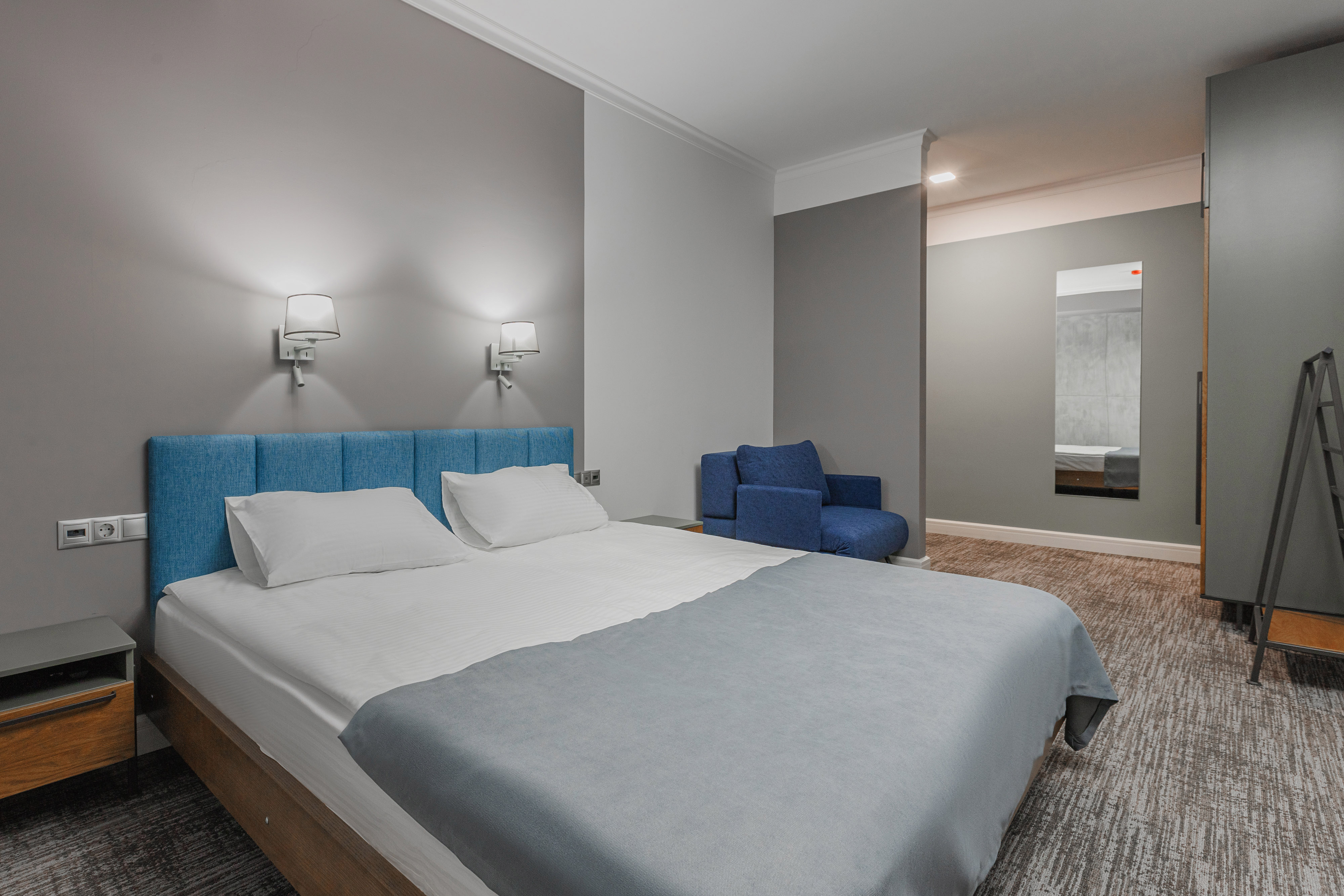 Трехместный номер общей площадью 28.7 м², оборудован кроватью размера «King Size» с ортопедическим матрасом, раскладным креслом 90х190см, рабочим местом, чайной станцией, холодильником, Smart TV, феном, косметическими и банными принадлежностями, гладильной доской и сейфом.