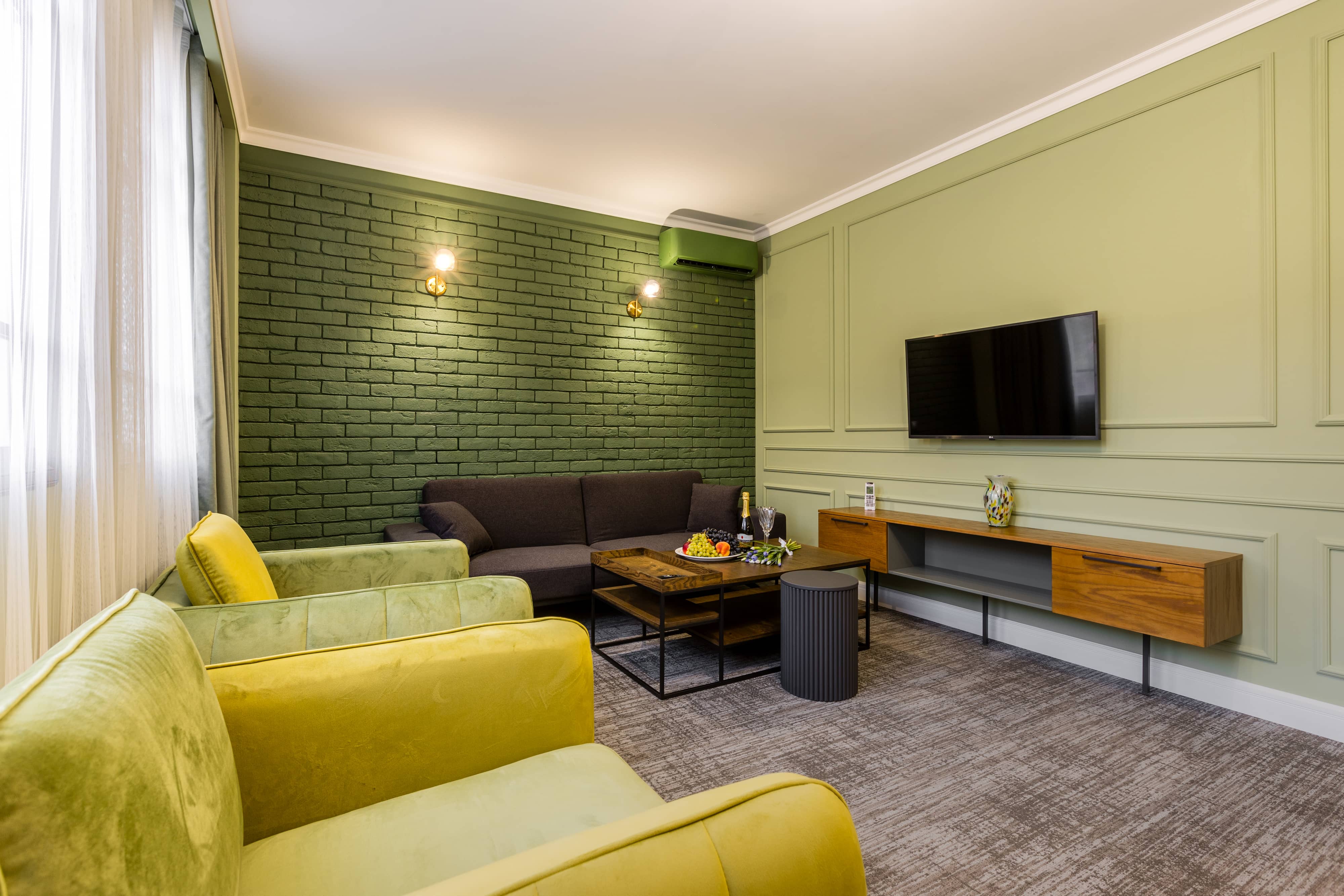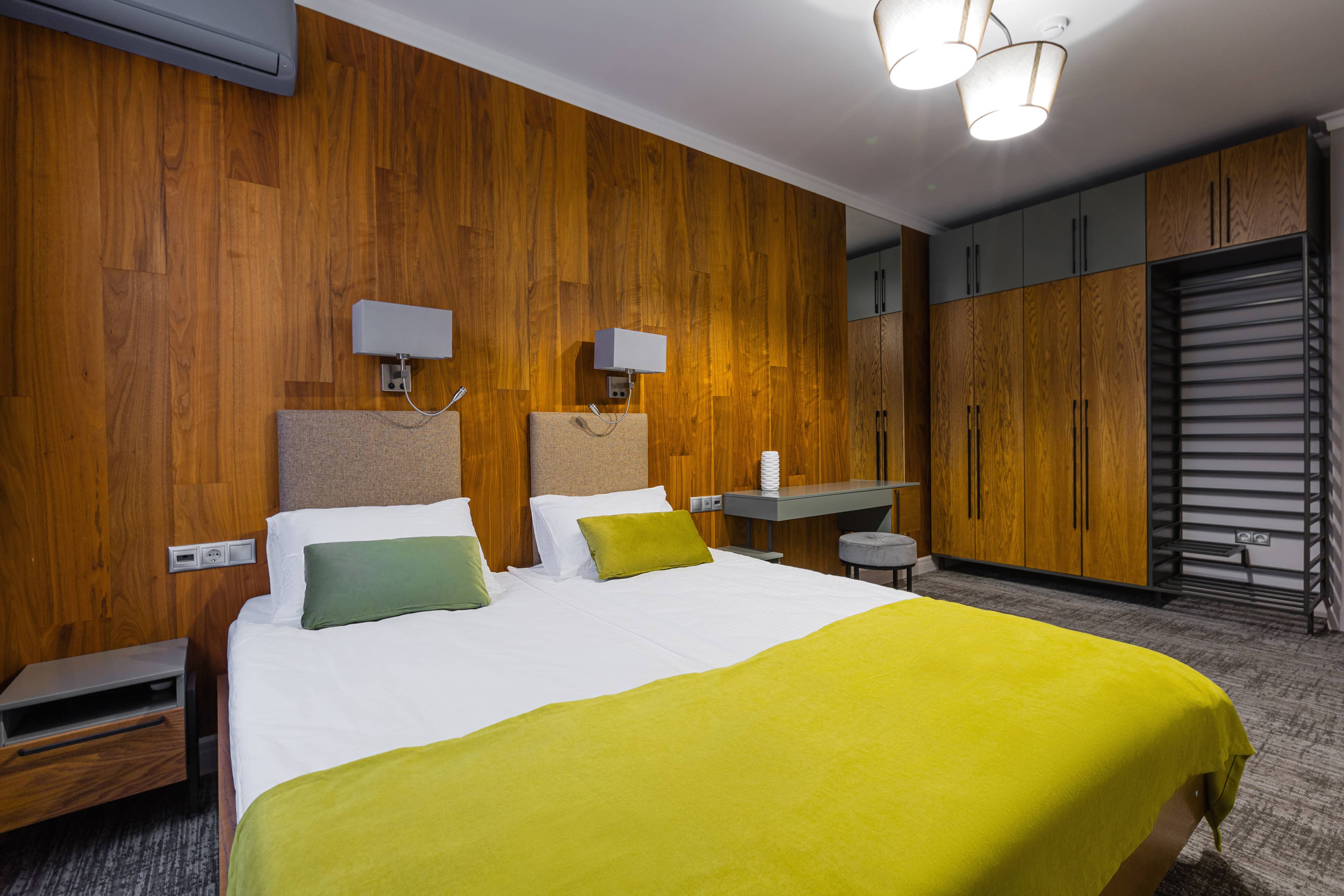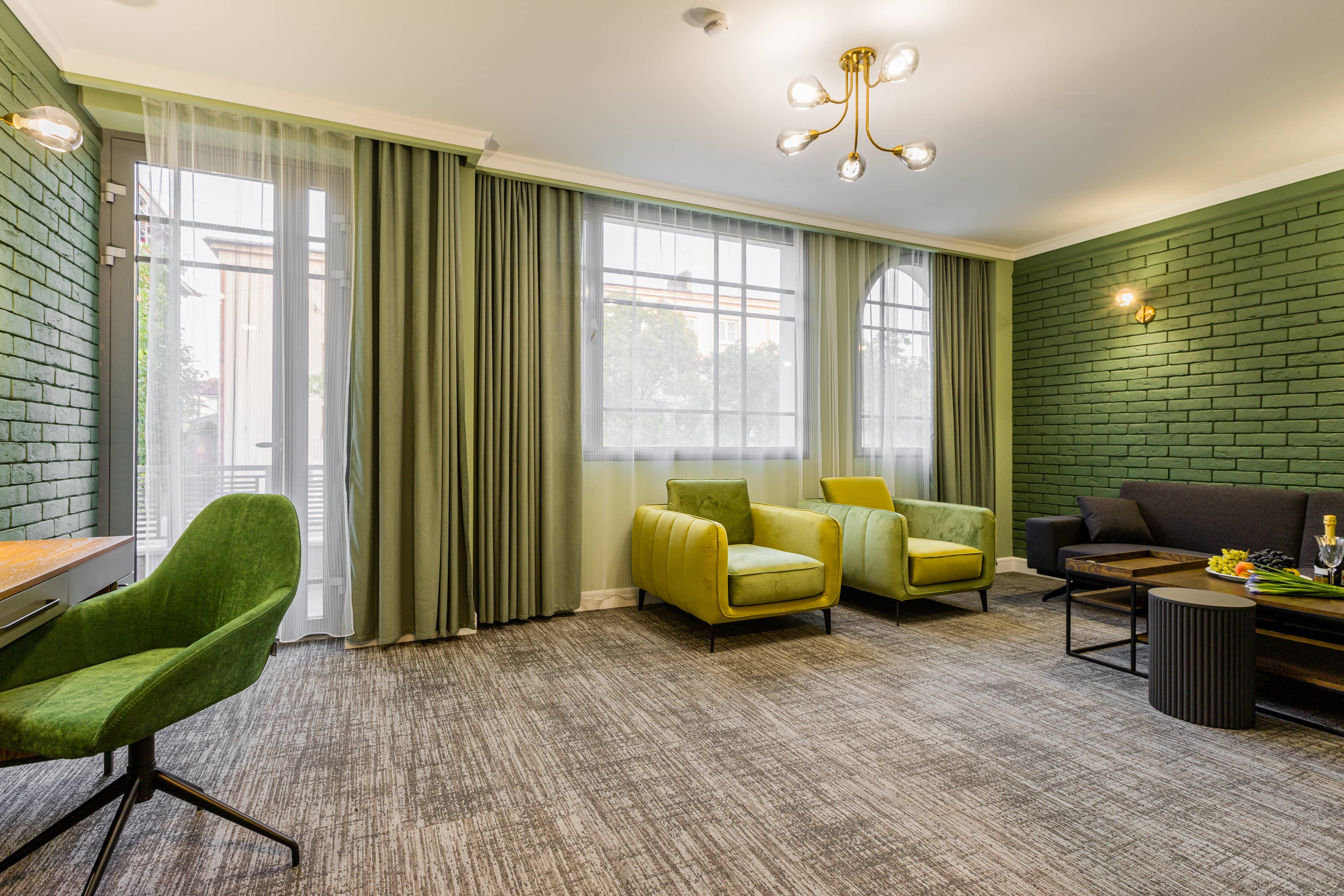 Трехместный номер общей площадью 48.6 м², оборудован кроватью размера «King Size» с ортопедическим матрасом, раскладным диваном, выходом на балкон, рабочим местом, раскладным диваном, чайной станцией, холодильником, Smart TV, феном, косметическими и банными принадлежностями, гладильной доской и сейфом.