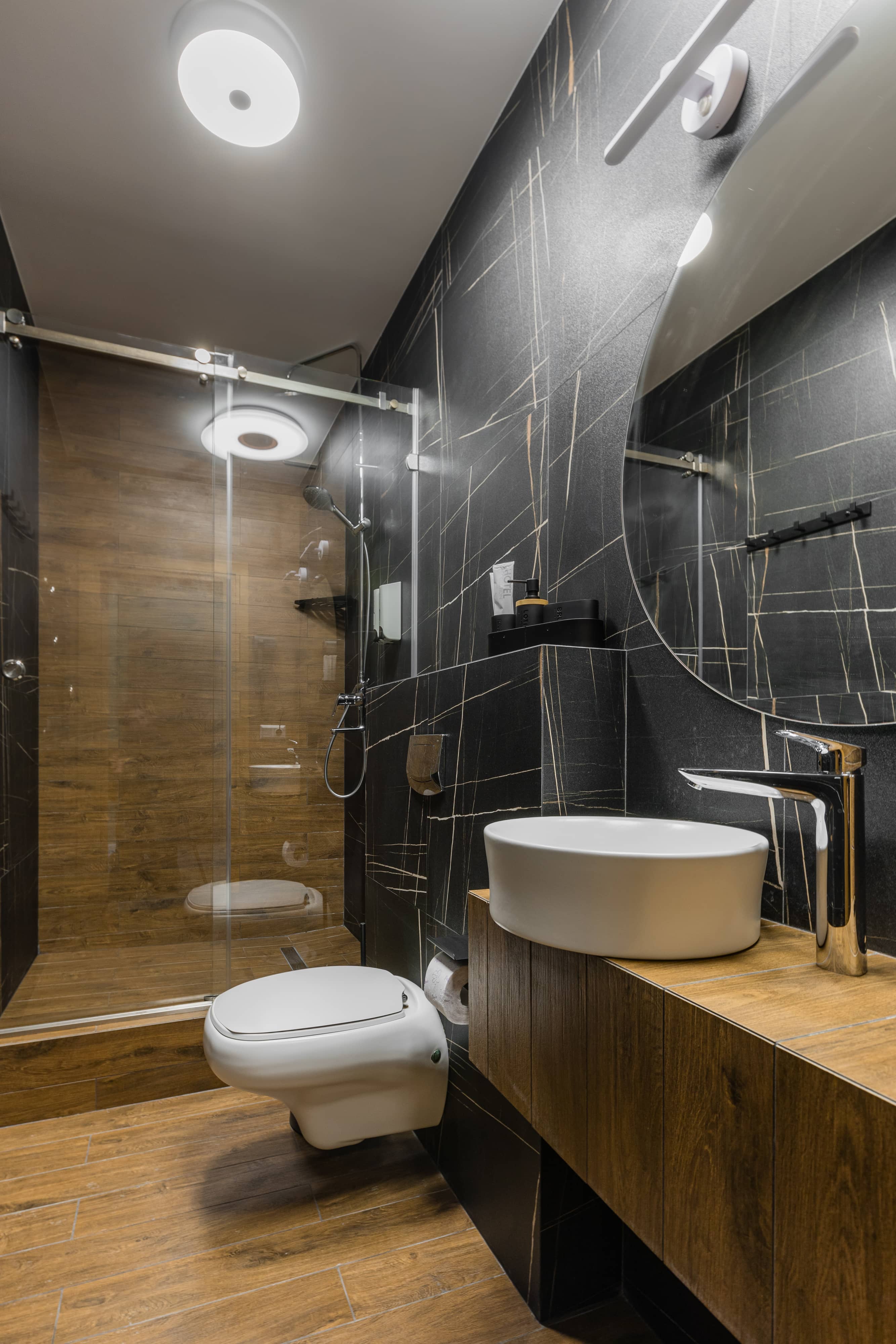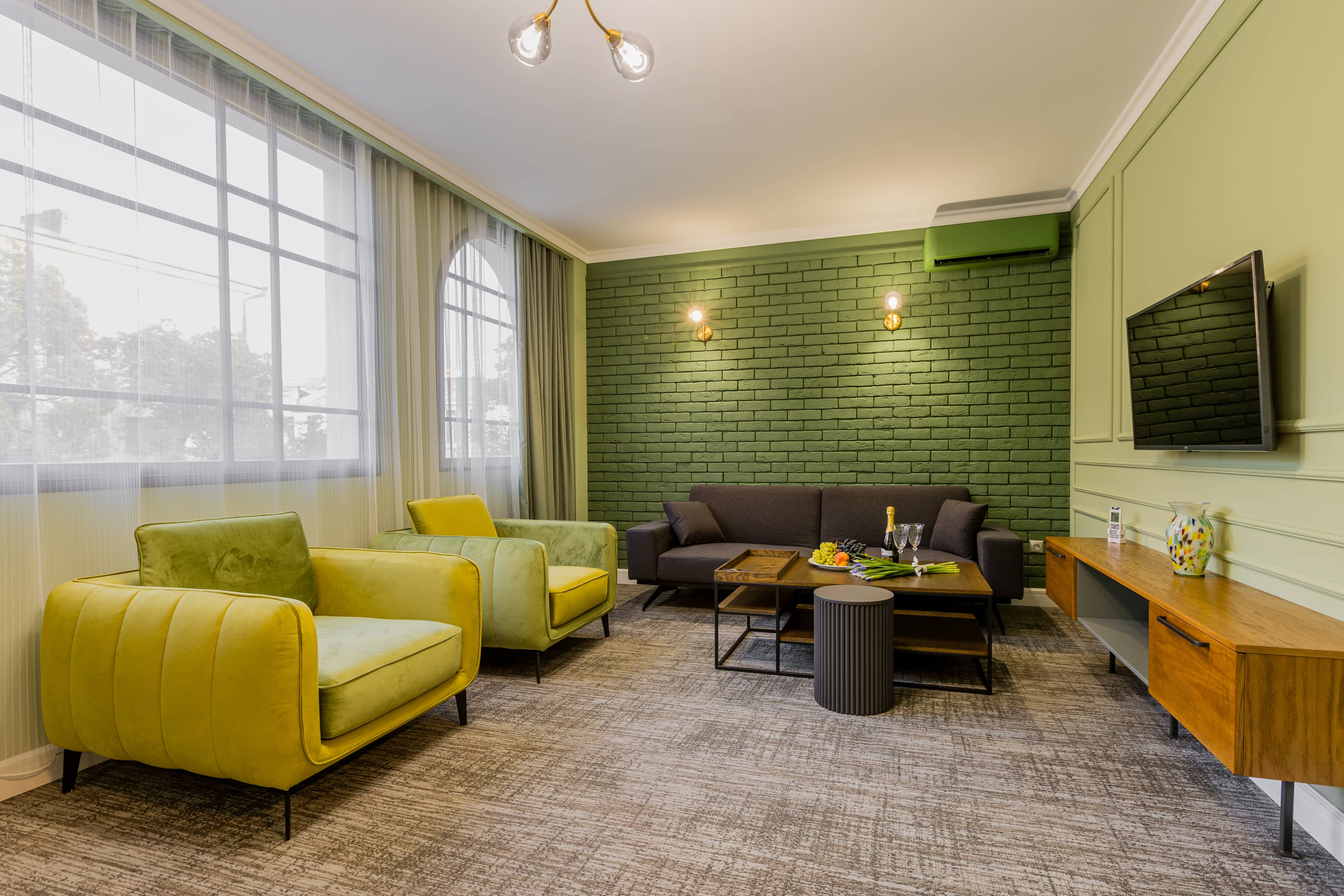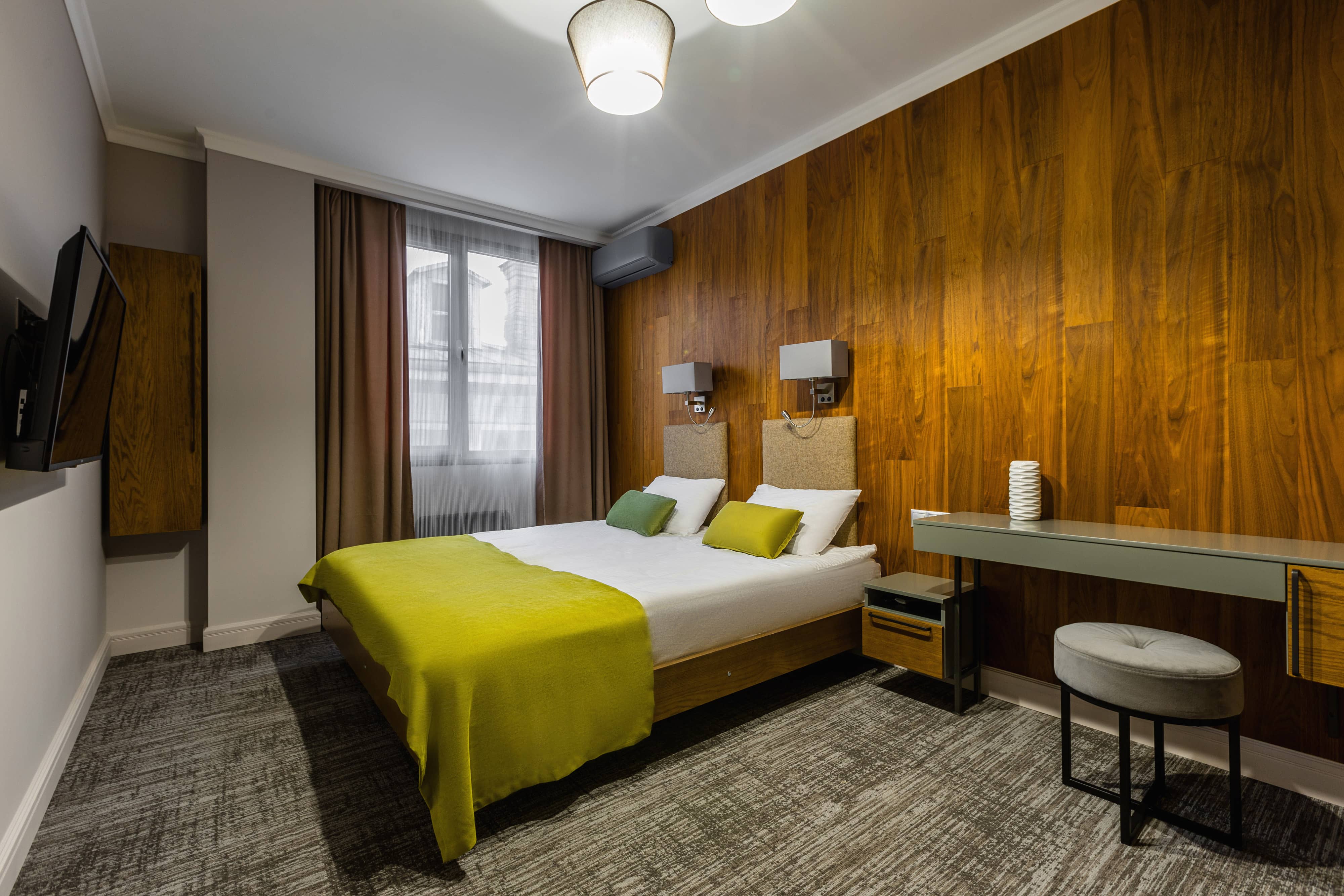 Трехместный номер общей площадью 48.6 м², оборудован кроватью размера «King Size» с ортопедическим матрасом, раскладным диваном, выходом на балкон, рабочим местом, раскладным диваном, чайной станцией, холодильником, Smart TV, феном, косметическими и банными принадлежностями, гладильной доской и сейфом.