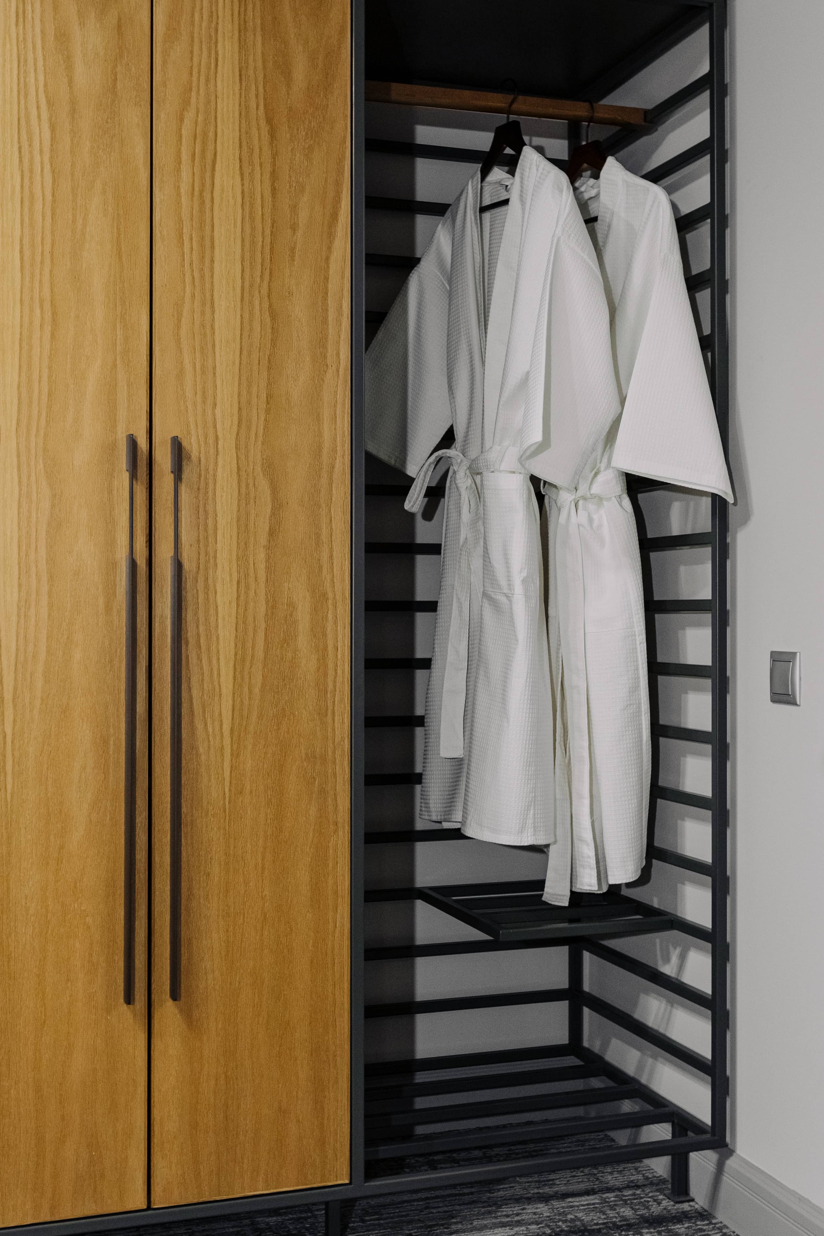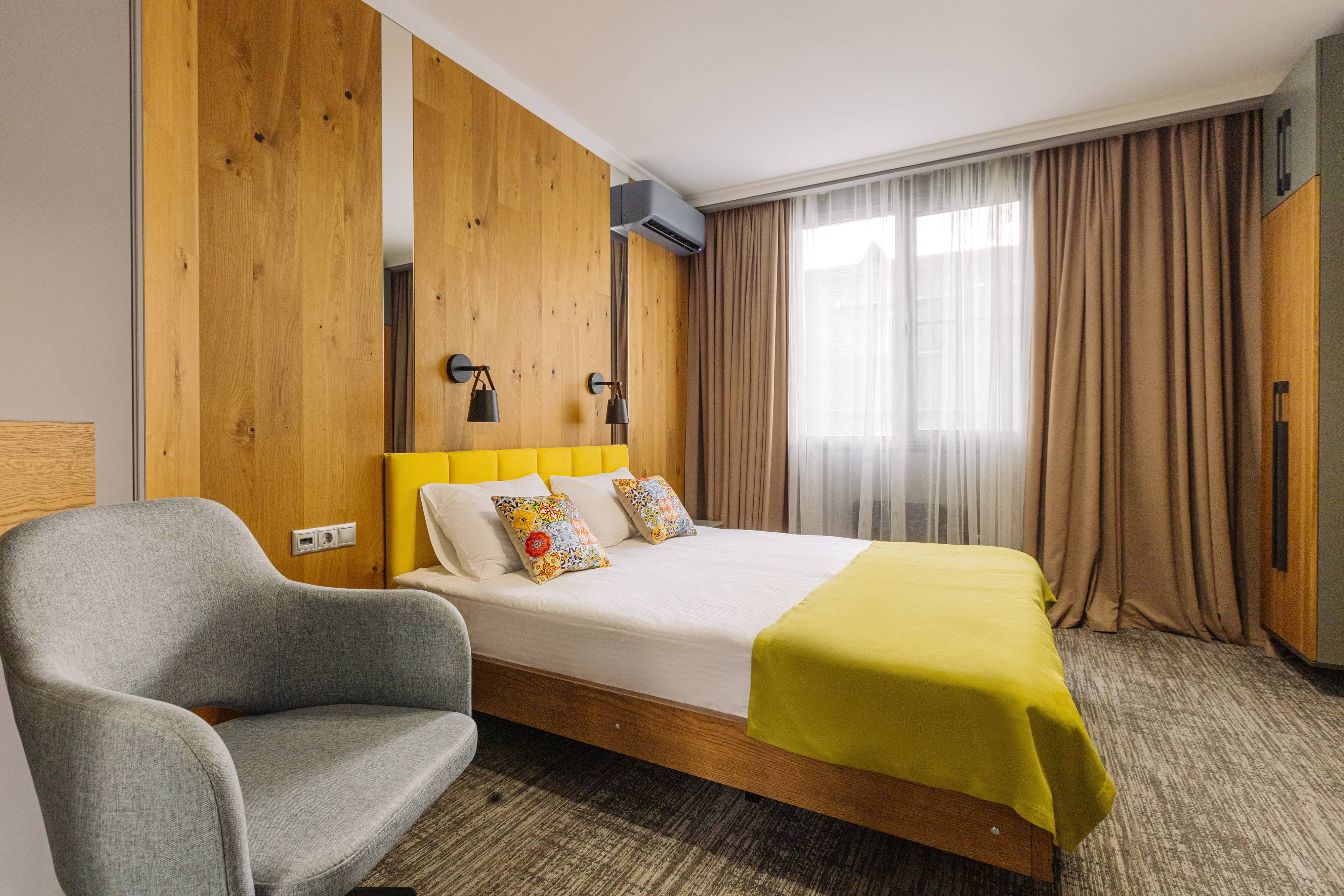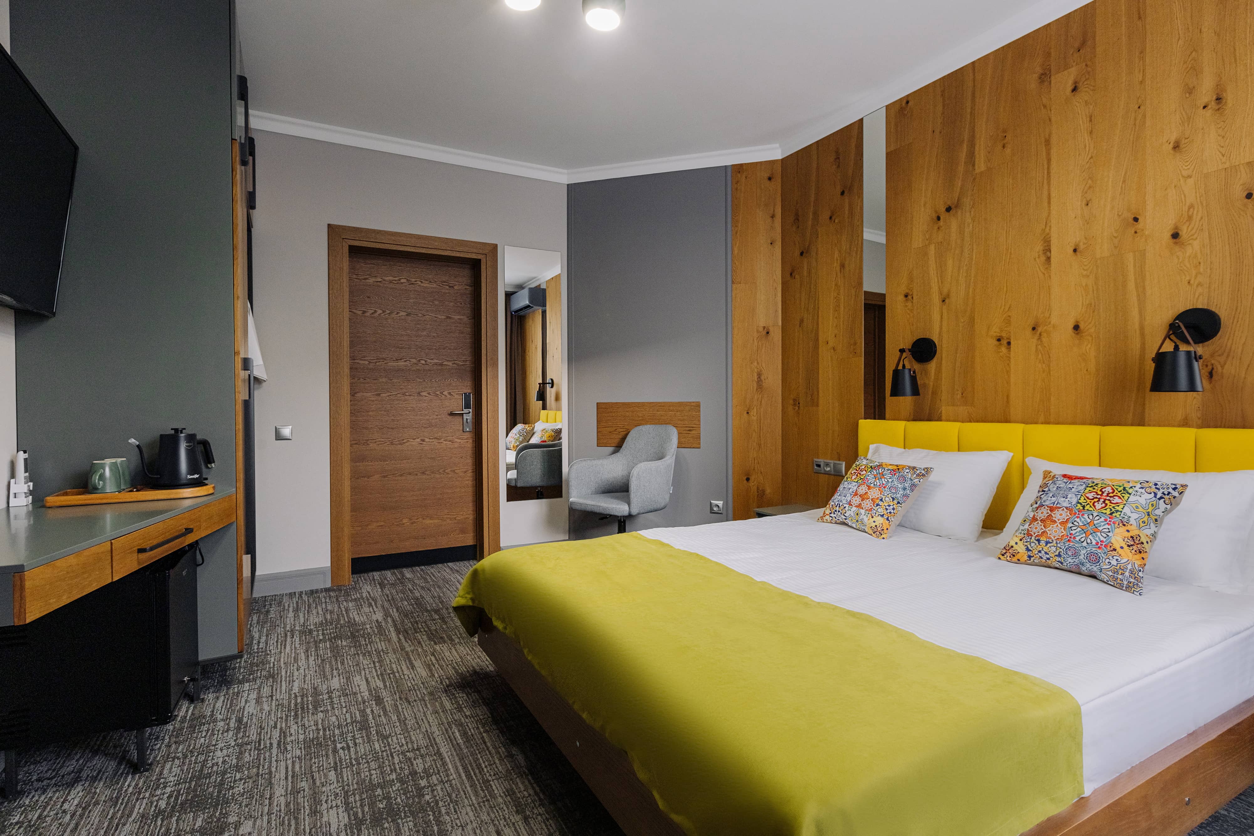 Двухместный номер общей площадью 16.8 м², кроватью размера "Queen Size" с ортопедическим матрасом, рабочим местом, чайной станцией, холодильником, Smart TV, феном, косметическими и банными принадлежностями, гладильной доской и сейфом.